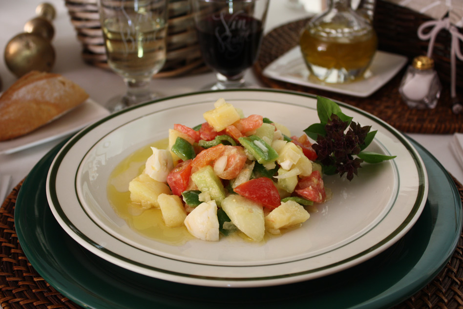 Se lavan las patatas y se ponen a cocer con piel en un recipiente con agua y dos cucharadas de sal hasta que estén tiernas. Una vez cocidas se dejan enfriar, se pelan y se cortan en dados de dos centímetros, al igual que el tomate, el pepino y los huevos duros. El pimiento y la cebolla se trocean en pedazos más pequeños. Se añade el atún en conserva al natural (opcional), la sal y se mezcla con abundante aceite de oliva virgen extra. Se agrega un chorrito de vinagre de Jerez y se vuelve a mezclar. Servir frío.