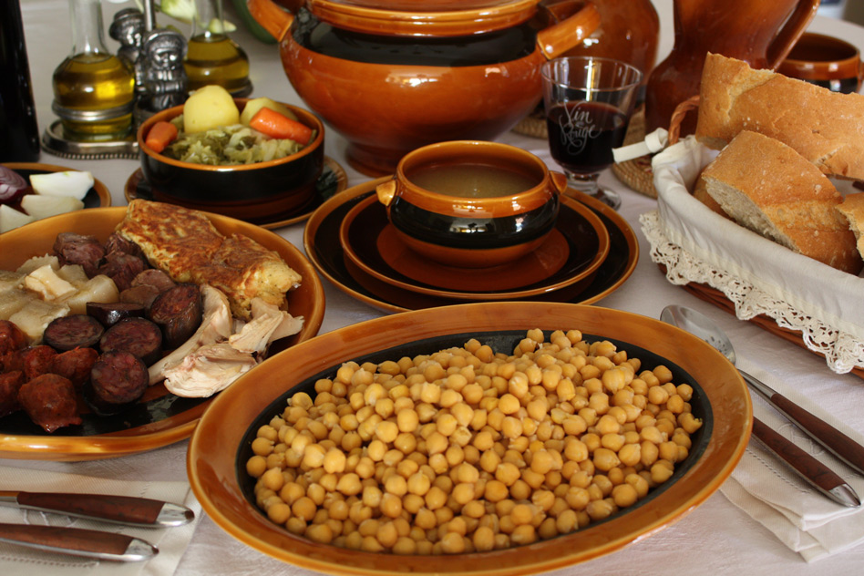 Se dejan en remojo los garbanzos la noche anterior bien cubiertos con agua tibia y con dos cucharadas de sal gorda. Se escurren. En un puchero grande se añade medio litro de agua y se añade la carne, la pechuga de pollo, los huesos de caña atados con un cordel para que no se salga el tuétano, y el tocino salado. Se pone en el fuego y se deja cocer durante 15 minutos. A continuación se incorporan los garbanzos metidos en una red para que no se desparramen. Se tapa y, cuando comience a hervir, se reduce el fuego para que cuezan lentamente. Posteriormente, se retira la espuma de la cocción las veces que sea necesario. Se vuelve a tapar y se deja cocer a fuego lento durante unas tres horas y media, vigilando que los garbanzos siempre estén cubiertos de agua (cuando sea necesario se añadirá agua caliente hasta dejarlos cubiertos). Una hora antes del final de la cocción se añade la sal y las zanahorias cortadas por la mitad. Media hora después se incorporan las patatas peladas y troceadas. El repollo se lava, se pica y se cuece aparte. Se escurre y se rehoga con un poco de aceite de oliva virgen extra y ajo. Se reserva. El chorizo y la morcilla también se hacen por separado.